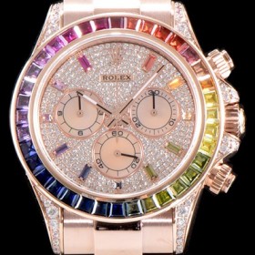 - 다이아몬드 & 핑크 자게 서브 다이얼 - 1:1수공정 바게뜨 컷 레인보우 다이아몬드 쥬얼 셋팅 인덱스 - 크로노그래프(Chronograph) 시간계 , 30분계 , 영구초침(Small Seconds) - 3시 방향에 30분단위 스탑워치서브 다이얼과 6시방향의 영구초침 서브다이얼 - 9시방향의 12시간 단위 스탑원치 크로노 그래프 기능이 장착 |