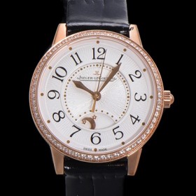 미러급 예거 르꿀르뜨 여성용 랑데뷰 나잇&데이 문페이즈 오토매틱 898A 타입 무브 34mm 금장시계 보석 배젤 가죽줄 화이트다이얼 jag9251 Ⅳ
