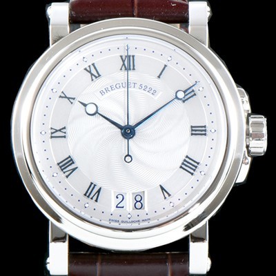 마린 손목시계, 스틸, 자동 무브먼트, 실버도금 엔진 터닝 다이얼, 18캐럿 골드, 브레게 로마 숫자 챕터 링과 형광 소재 분 마커, 6시 자리에 위치한 대형 날짜 윈도우, 블루 컬러 스틸의 오픈-팁 형광 브레게 핸즈, 사파이어 크리스탈 엔진 터닝 케이스백, 65시간 파워리저브, 100미터 방수. 추가 모델: 스틸 브레이슬릿.