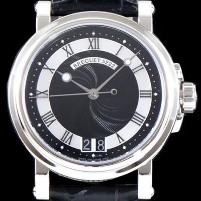 마린 손목시계, 스틸, 자동 무브먼트, 실버도금 엔진 터닝 다이얼, 18캐럿 골드, 브레게 로마 숫자 챕터 링과 형광 소재 분 마커, 6시 자리에 위치한 대형 날짜 윈도우, 블루 컬러 스틸의 오픈-팁 형광 브레게 핸즈, 사파이어 크리스탈 엔진 터닝 케이스백, 65시간 파워리저브, 100미터 방수. 추가 모델: 스틸 브레이슬릿.