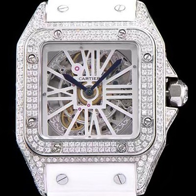 미러급 까르띠에 남성용 신상출시!!산토스 뒤몽 컬렉션 18k 화이트 골드 다이아몬드 셋팅 스켈레톤 다이얼 오토매틱 무브먼트 CAR0110 Ⅳ