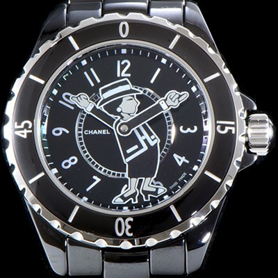 - 블랙 래커 다이얼,화이트 아라비안 인덱스 코코 샤넬을 나타내는 캐릭터를 중심으로 양쪽 팔이 시간과 분을 가리킨다 |