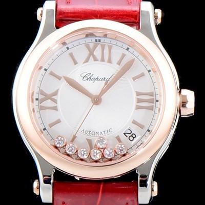 여성미가 넘치는 해피 스포츠 36mm 오토매틱 워치는 로즈 골드와 스테인레스 스틸 소재로 제작되었으며, 고도의 노하우와 세련된 가죽 스트랩이 돋보이는 완벽한 쇼파드 스타일의 워치입니다. 쇼파드의 시그니처인 무빙 다이아몬드는 생동감 넘치는 빛의 향연 속에서 발랄하게 춤을 추고 있으며, 현대적인 실버톤 다이얼은 로즈 골드 톤 로마 숫자 및 핸즈와 우아한 조화를 이룹니다. |
