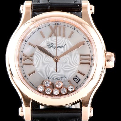 여성미가 넘치는 해피 스포츠 36mm 오토매틱 워치는 스테인레스 스틸 소재로 제작되었으며, 고도의 노하우와 세련된 가죽 스트랩이 돋보이는 완벽한 쇼파드 스타일의 워치입니다. 블루 다이얼이 로마 숫자와 핸즈를 돋보이게 하고, 쇼파드의 시그니처인 무빙 다이아몬드 7개가 생동감 넘치는 빛의 향연 속에서 발랄하게 춤을 춥니다. |
