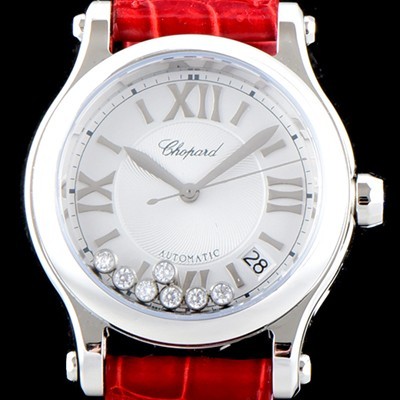 여성미가 넘치는 해피 스포츠 36mm 오토매틱 워치는 스테인레스 스틸 소재로 제작되었으며, 고도의 노하우와 세련된 가죽 스트랩이 돋보이는 완벽한 쇼파드 스타일의 워치입니다. 블루 다이얼이 로마 숫자와 핸즈를 돋보이게 하고, 쇼파드의 시그니처인 무빙 다이아몬드 7개가 생동감 넘치는 빛의 향연 속에서 발랄하게 춤을 춥니다. |