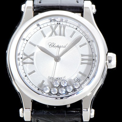 여성미가 넘치는 해피 스포츠 36mm 오토매틱 워치는 스테인레스 스틸 소재로 제작되었으며, 고도의 노하우와 세련된 가죽 스트랩이 돋보이는 완벽한 쇼파드 스타일의 워치입니다. 블루 다이얼이 로마 숫자와 핸즈를 돋보이게 하고, 쇼파드의 시그니처인 무빙 다이아몬드 7개가 생동감 넘치는 빛의 향연 속에서 발랄하게 춤을 춥니다. |
