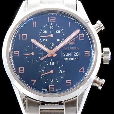 태그호이어 까레라 칼리버 16 카 레이싱에서 영감을 얻은 클래식하면서도 현대적인 스포츠 워치 블랙 유광 다이얼 60초/분 스케일이 장착된 블랙 플랜지 3개의 카운터 폴리싱 처리된 로즈 골드 도금 숫자 인덱스 교차 마감한 로즈 골드 도금 아워 및 미닛 핸즈, 화이트 슈퍼 루미노바 폴리싱 처리된 로즈 골드 도금 중앙 핸드 |